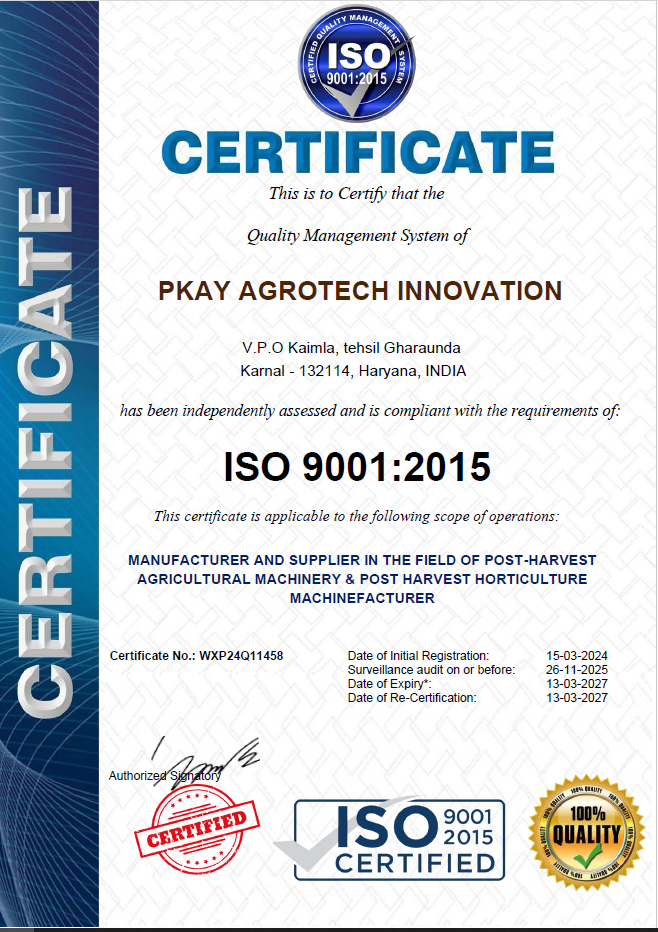 Pkay Agrotech Innovation established in 2020, is proud to offering total integrated services and turnkey solutions for Seed Processing Plant.  Pkay Agrotech Innovation is leading manufacturer and supplier of Post-Harvest Agricultural Machinery in the region including Seed Processing Plants, Grain Cleaning Machine, Grain Moisture Meters, Mini Rice Mill, Mini Dall Mill, Mini Seed Grader, Lab Equipments, Air Aspirator for light Seed, Color Sorter, Weighing and Bagging Machines, Round Fruits and Vegetables Grading Machine, Material Handling Equipment, Loading-Unloading Conveyor and Bag Stacker etc.